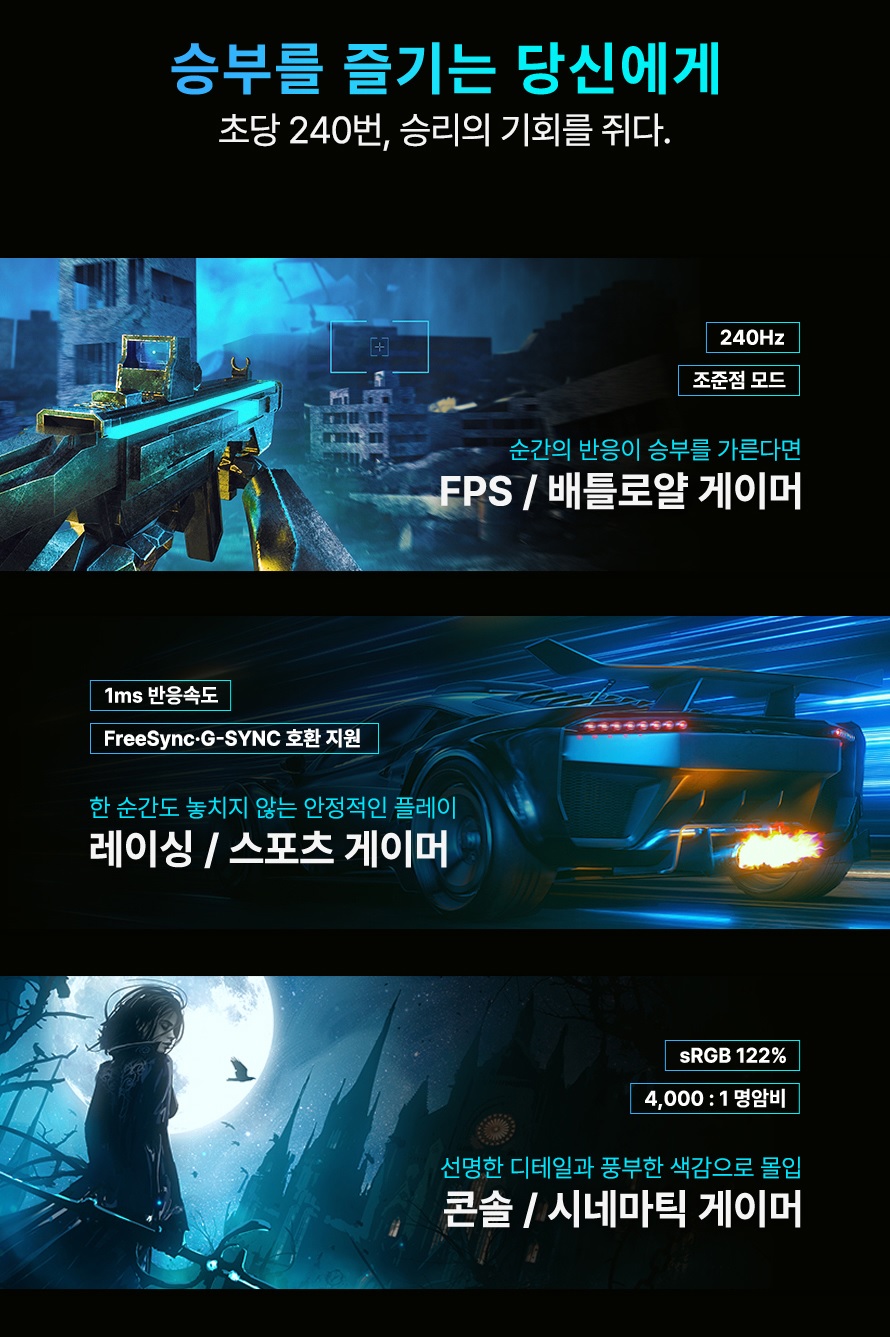 초당 240프레임을 표현할 수 있어 빠른 화면 전환에서도 선명함 유지 - 1ms 응답속도