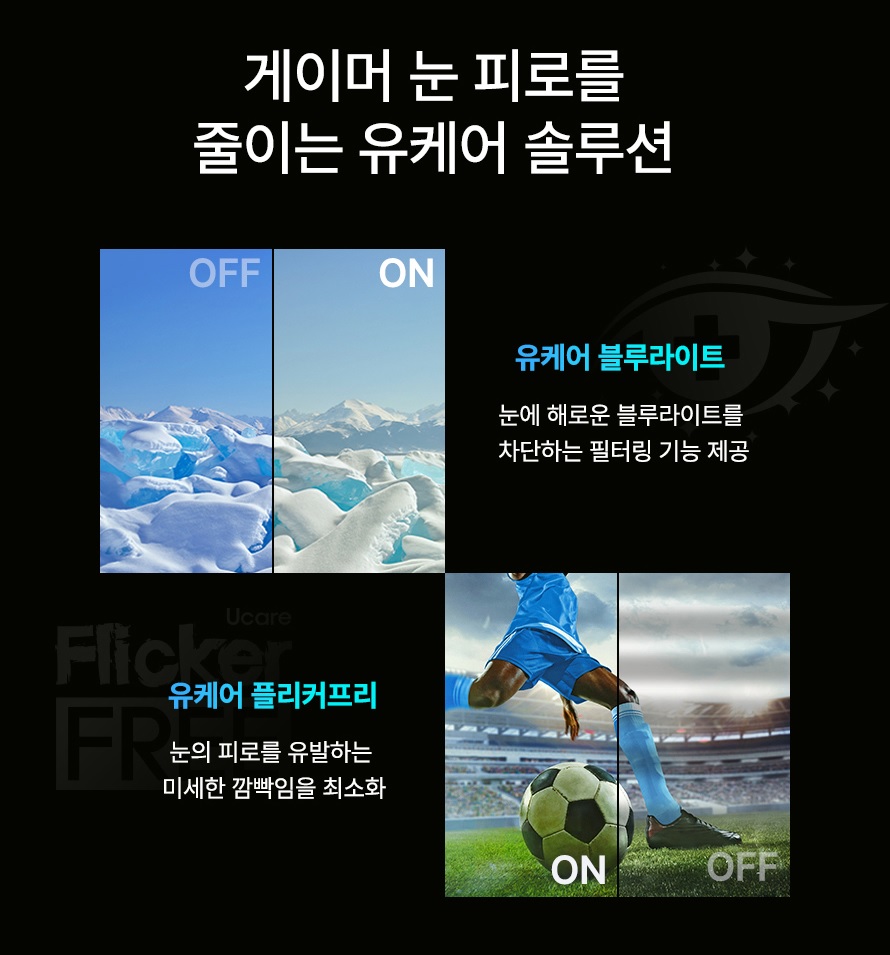 장시간 게임이나 작업을 하는 유저들을 위해 플리커프리와 유케어 블루라이트 차단 기능을 적용했습니다.